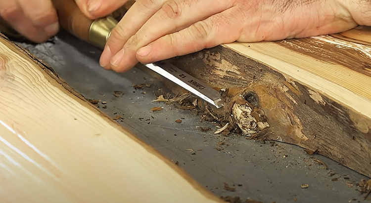 Необходимо произвести зачистку всех трещин, щелей, а также обзола, чтобы ничего не попало в заливку.Обзол - это естественный край доски, который может иметь кору.Нам потребуются сл...
