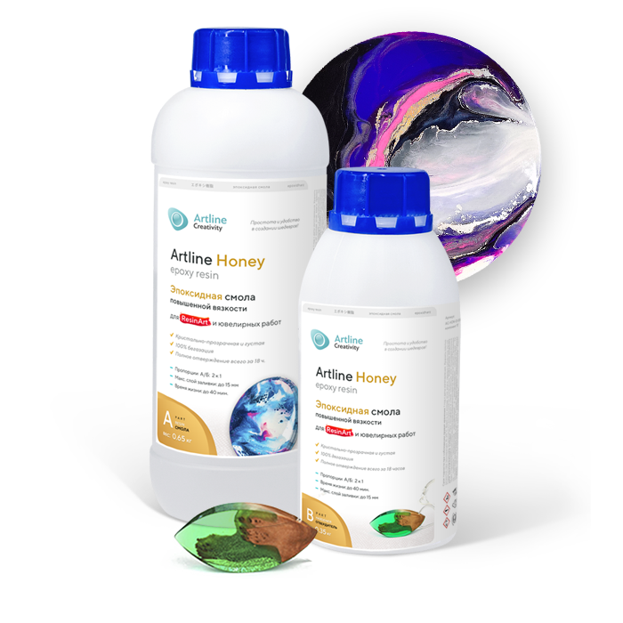 Artline Honey epoxy — эпоксидная смола повышенной вязкости, идеальна для рисования картин и заливки других изделий в формы и молды, создания ювелирных изделий. Смола легко колеруется, в том числе сухими пигментами, которые не оседают на дне заливки. Благодаря повышенной вязкости, пигменты равномерно распределяются по всей глубине. Смола готова к заливке после тщательного смешивания двух компонентов: "А" и "B".